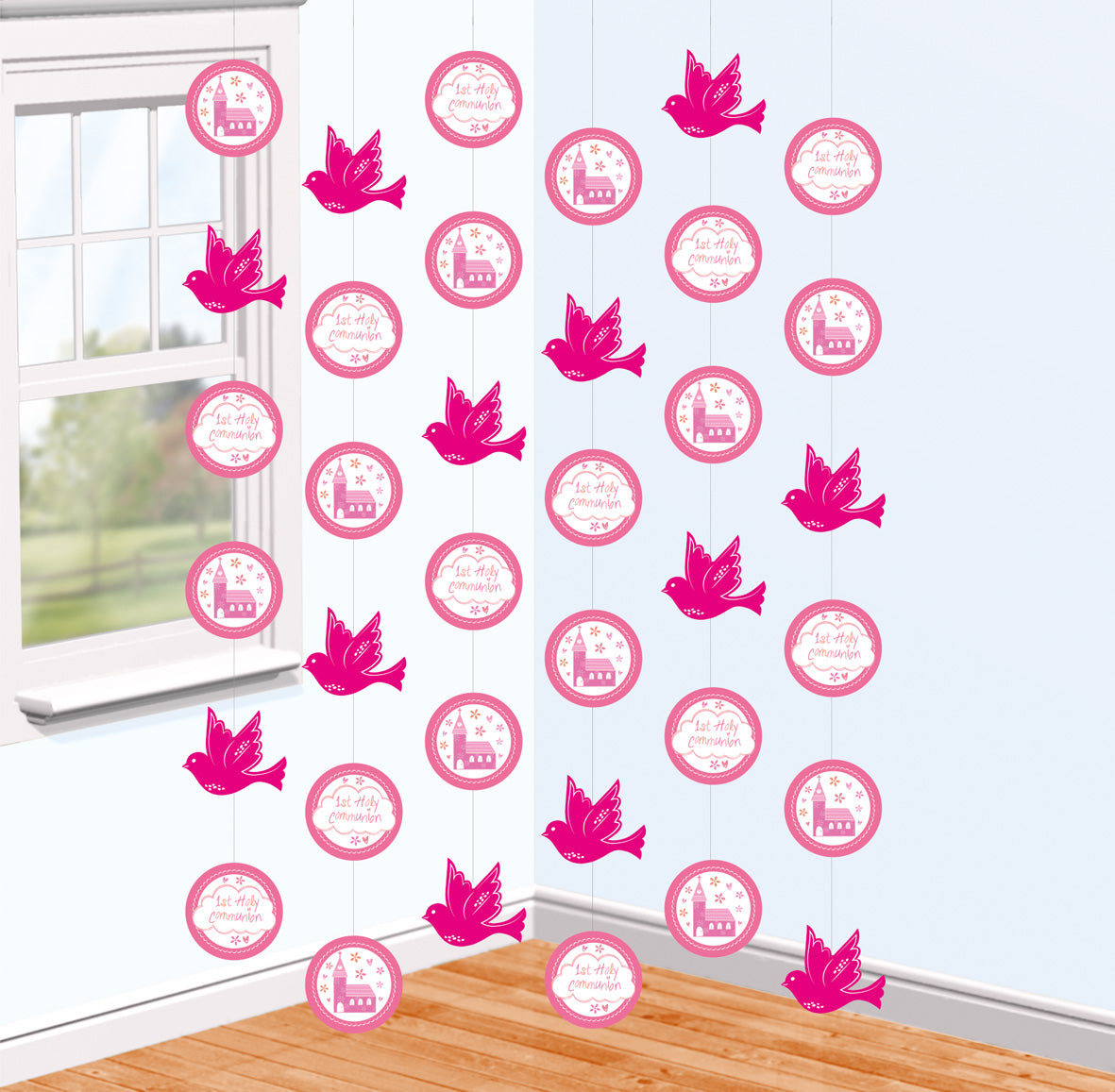 - Ballons und Girlanden: Luftballons und Girlanden sind ein beliebtes Dekorationselement, das Leichtigkeit und Freude in die Kommunionsfeier bringt. Wähle Ballons in passenden Farben und forme daraus Bögen, Girlanden oder schwebende Arrangements, die den Raum verschönern.