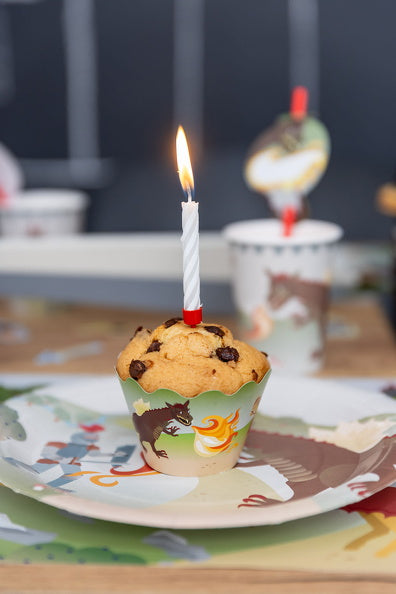 12 Deko-Banderolen für Muffins und Cupcakes im Drache & Ritter Design. Die Banderolen sind gefertigt aus 170g Papier und auf 3 Größen einstellbar