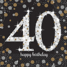 Diese 16 Golden 40th Birthday Sparkles Servietten sind eine schöne Idee für den 40. Geburtstag. Sie sind ein echter Hingucker und bieten eine schöne Tischdeko, die schlicht, aber elegant ist. Auf dem schwarzen Hintergrund sticht die große Zahl 40 schön hervor, sowie auch andere hübsche Details in Gold und Silber.