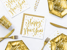 Diese weißen Servietten mit goldenen Sternen und goldener Schrift als Verzierung sind ideal für jede Silvesterparty. Aufgefaltet sind die Maße 33 x 33 cm und zusammengefaltet 16,5 x 16,5 cm.
