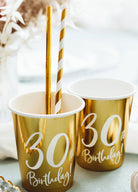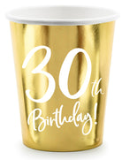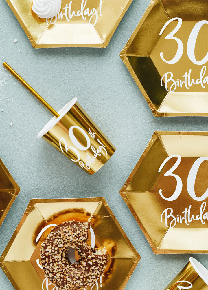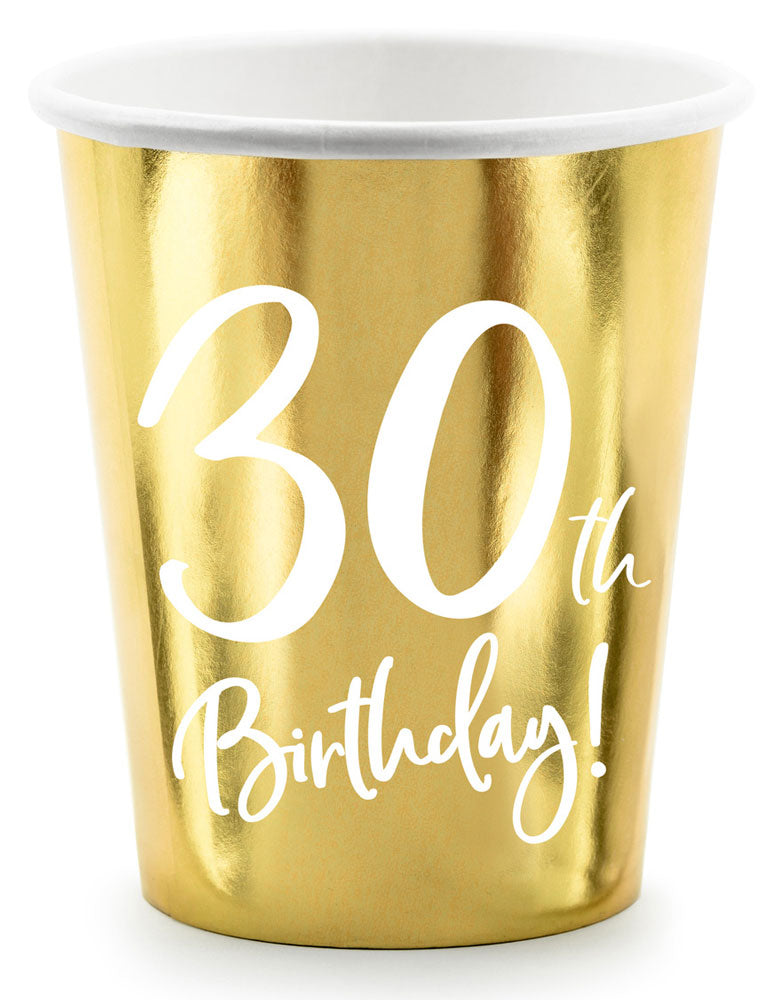Der 30. Geburtstag. Das muss gebührend und glamourös gefeiert werden. Mit den 6 Glossy 30th Birthday Becher 220ml hast du schonmal die passenden Trinkbehälter. Möchtest du auch deine Speisen, auf edlem Geschirr platzieren, enpfehlen wir die passenden Glossy Birthday Pappteller, die ebenfalls im schimmernden Golddesign mit 30th Birthday Aufschrift gestaltet sind.