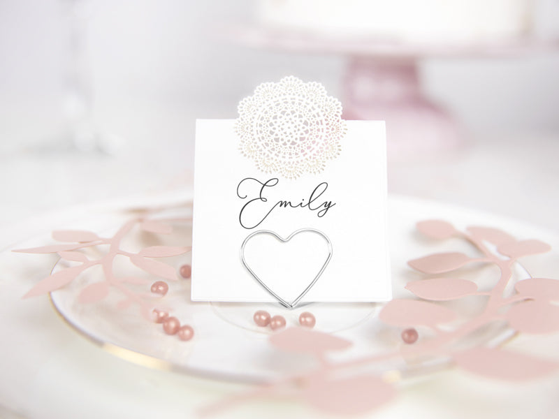 Die 'silbernes Herz' Tischkartenhalter sind eine wunderschöne Option, um deinen Gästen zu zeigen, wo sie sitzen! Die 10 Kartenhalter sind 2,5cm groß, in hübscher Herz-Form und edlem Silber gehalten, und daher ideal für Hochzeiten und große Jahrestag-Feiern geeignet.