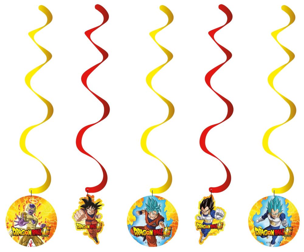 Diese 5 Dragon Ball Deckenhänger dürfen auf keiner Dragonball-Party fehlen! Du erhältst 5 Spiralhänger mit unterschiedlich bebilderten Wobblern an den Enden. Die Swirls sind 60cm lang und der Wobbler misst 17cm im Durchmesser.