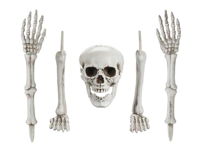 Gruselfaktor garantiert! Dieses 5-teilige Skelett-Deko-Set besteht aus einem realistisch gestalteten Schädel, zwei Händen und zwei Beinen. Die Einzelteile lassen sich flexibel im Garten, auf dem Rasen oder in Pflanzbeeten platzieren. So sieht es aus, als würde ein Skelett gerade aus dem Boden kriechen oder feststecken!
