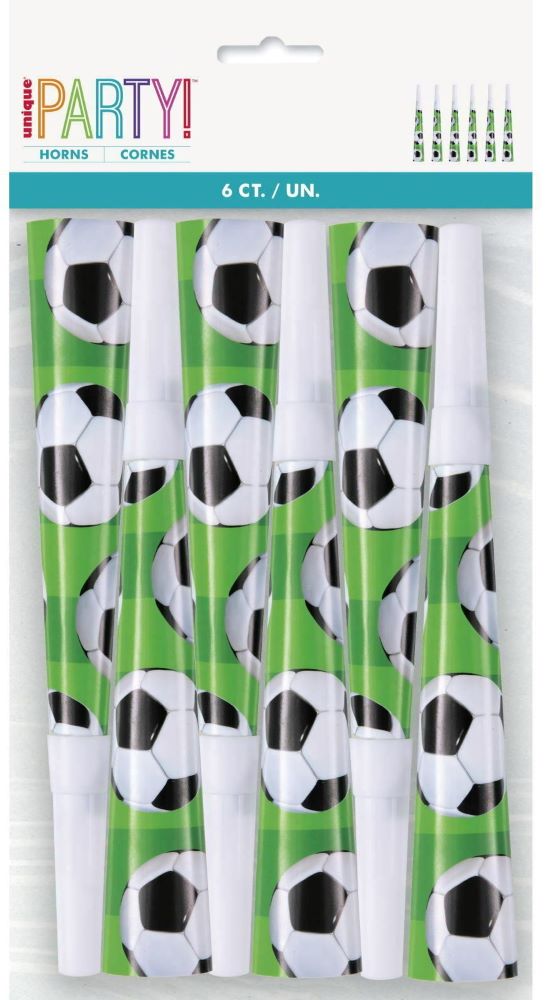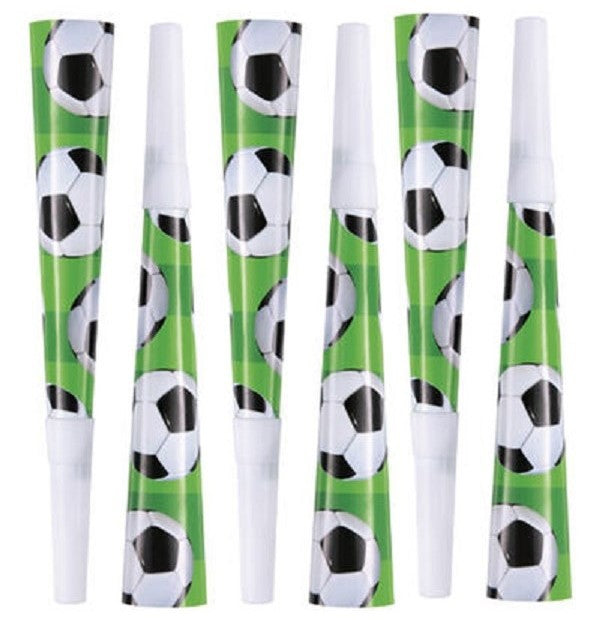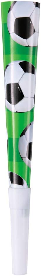 Die 6 Fußball Party Tröten, mit einer Größe von 20 cm und einem coolen Fußball-Motiv auf knallig grünem Untergrund aufgedruckt, sind ein lustiger Partykracher oder ein tolles Mitgebsel für Geburtstagsfeiern.