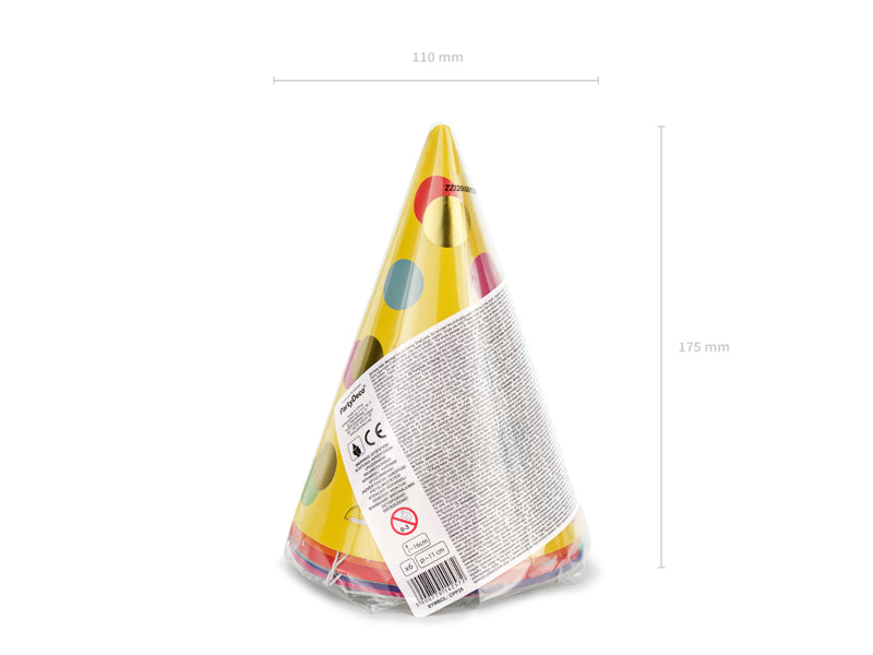 Spiel, Spaß, Spannung, Partyhut - von letzterem erhältst du gleich 6 Stück mit unseren "bunte Punkte Party-Hütchen". Spiel und Spaß kommen da im Anschluss ganz automatisch. Die Partyhütchen mit Gummizug sind 16cm hoch und haben einen Durchmesser von 11cm.