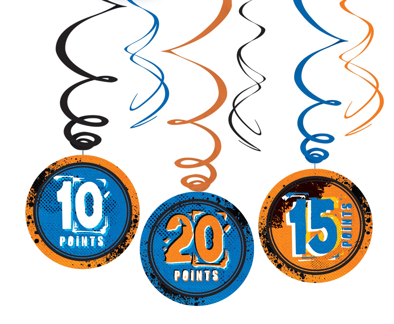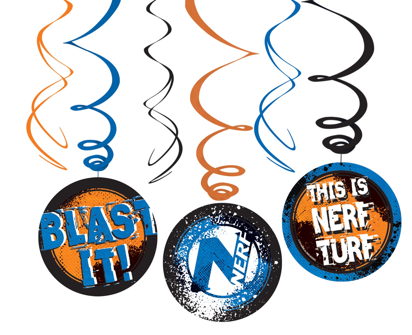 Bei einer Nerf-Mottoparty darf die Dekoration nicht fehlen! Mit den 6 Nerf Have a Blast Spiral Hängern verleihst du deiner Feier das ultimative Action-Flair. Im Lieferumfang sind 6 Spiral Hänger (3 mit Schild, drei ohne) enthalten.
