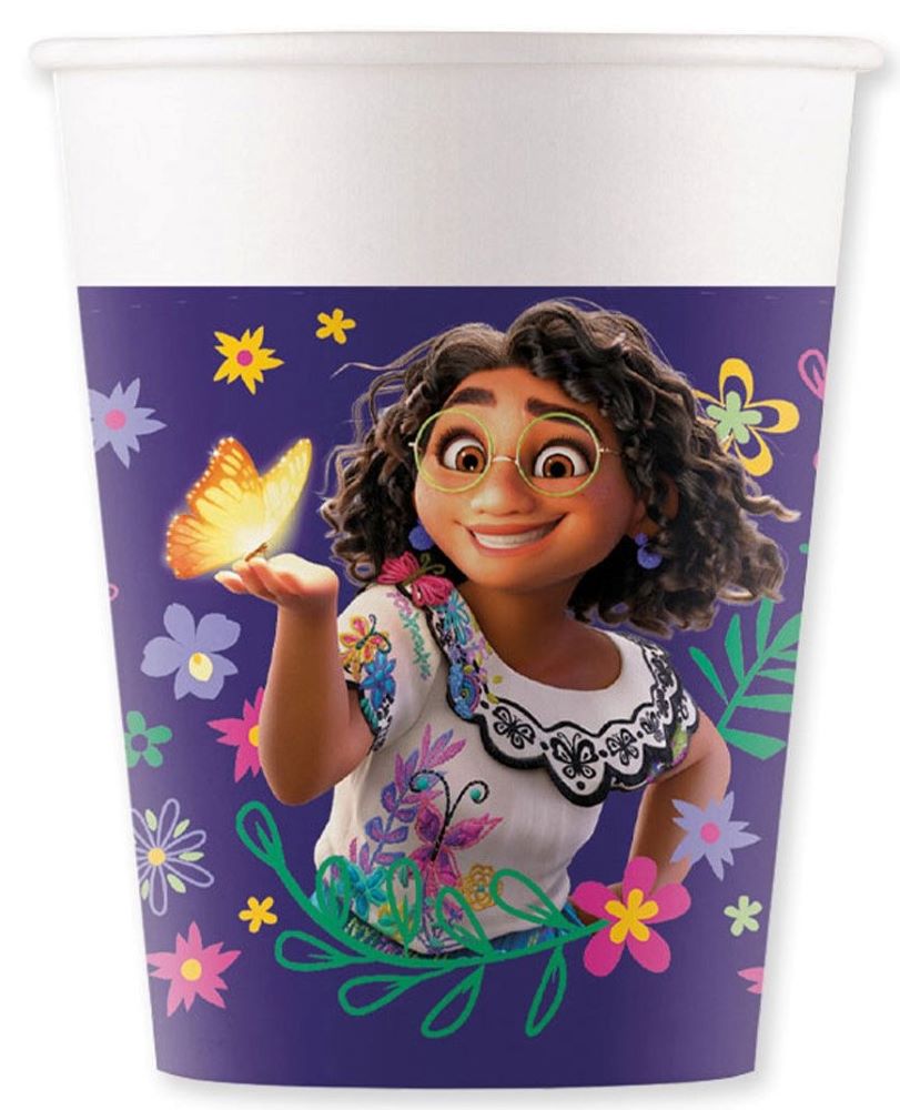 Mirabel mag zwar nicht wie ihre Geschwister übernatürliche Gaben besitzen, dennoch ist sie nicht weniger bezaubernd. Genauso bezaubernd sind auch die Disneys Encanto Pappbecher. Die 8 Becher mit einem Fassungsvermögen von 200ml zeigen auf einem Lila-Blauen Hintergrund Mirabel mit einem Schmetterling. Zahlreiche hübsche Blüten verzieren ebenfalls den Becher.