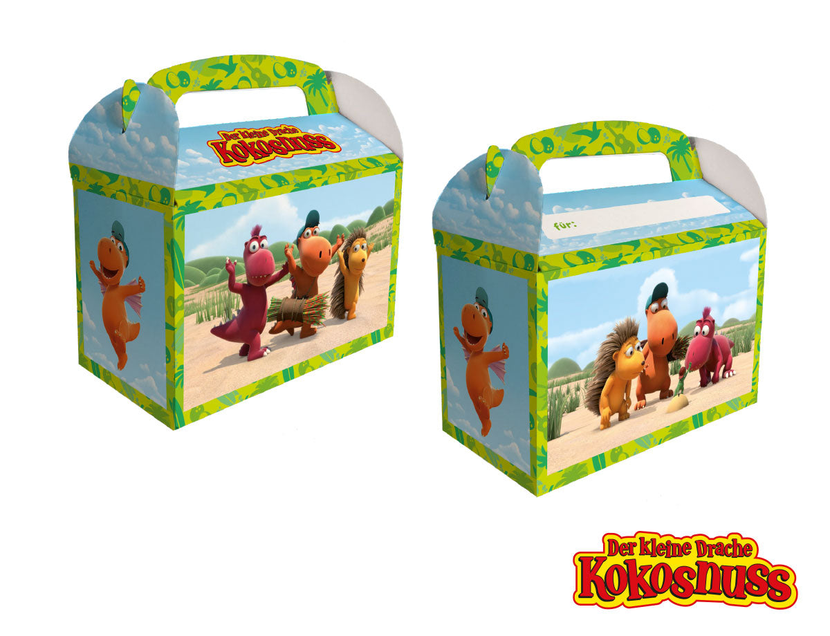 Die coolen Kleiner Drache Kokosnuss Geschenkboxen sind ideal für kleine Präsente, aber auch um Snacks für den Geburtstags-Ausflug zu transportieren oder kleine Mitgebsel zu verstauen. Dank des großen Namensfeldes kann hier auch keine der 8 Geschenkboxen vertauscht werden. Sie sind 10,5cm x 9cm x 8cm groß und mit zahlreichen Motiven von Drache Kokosnuss und seinen Freunden bedruckt.