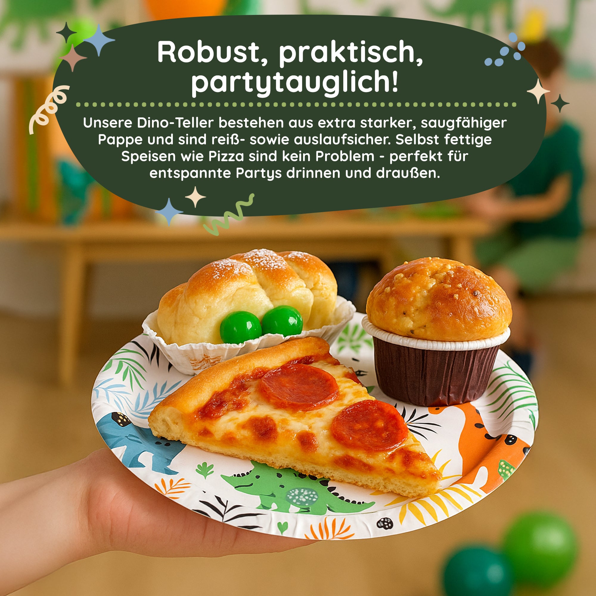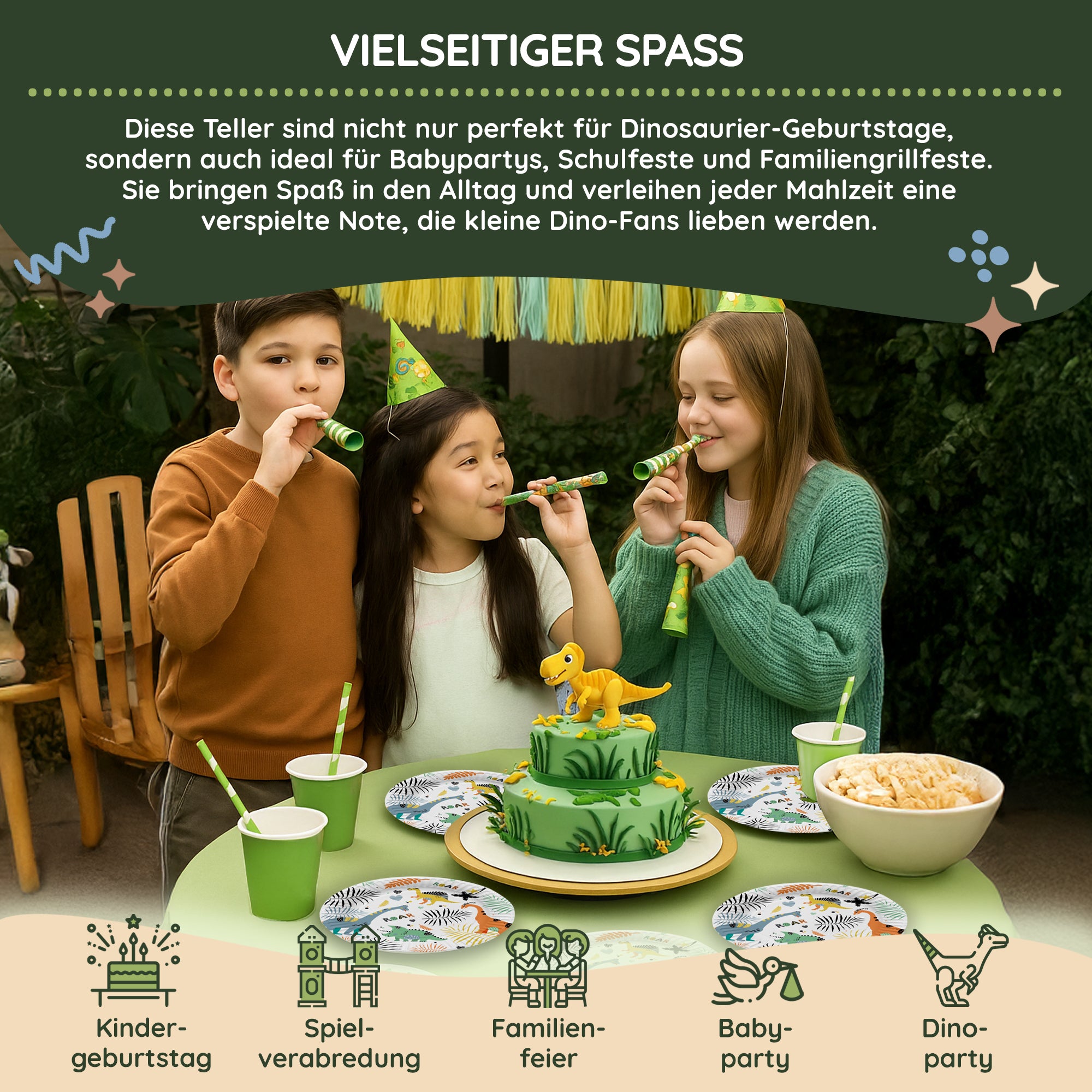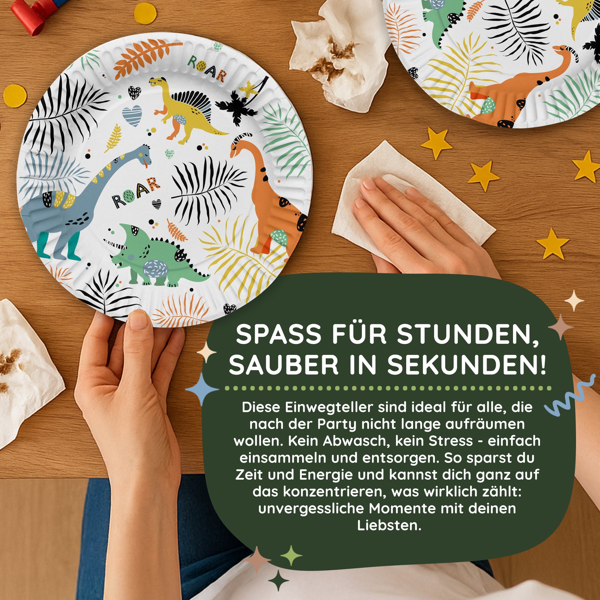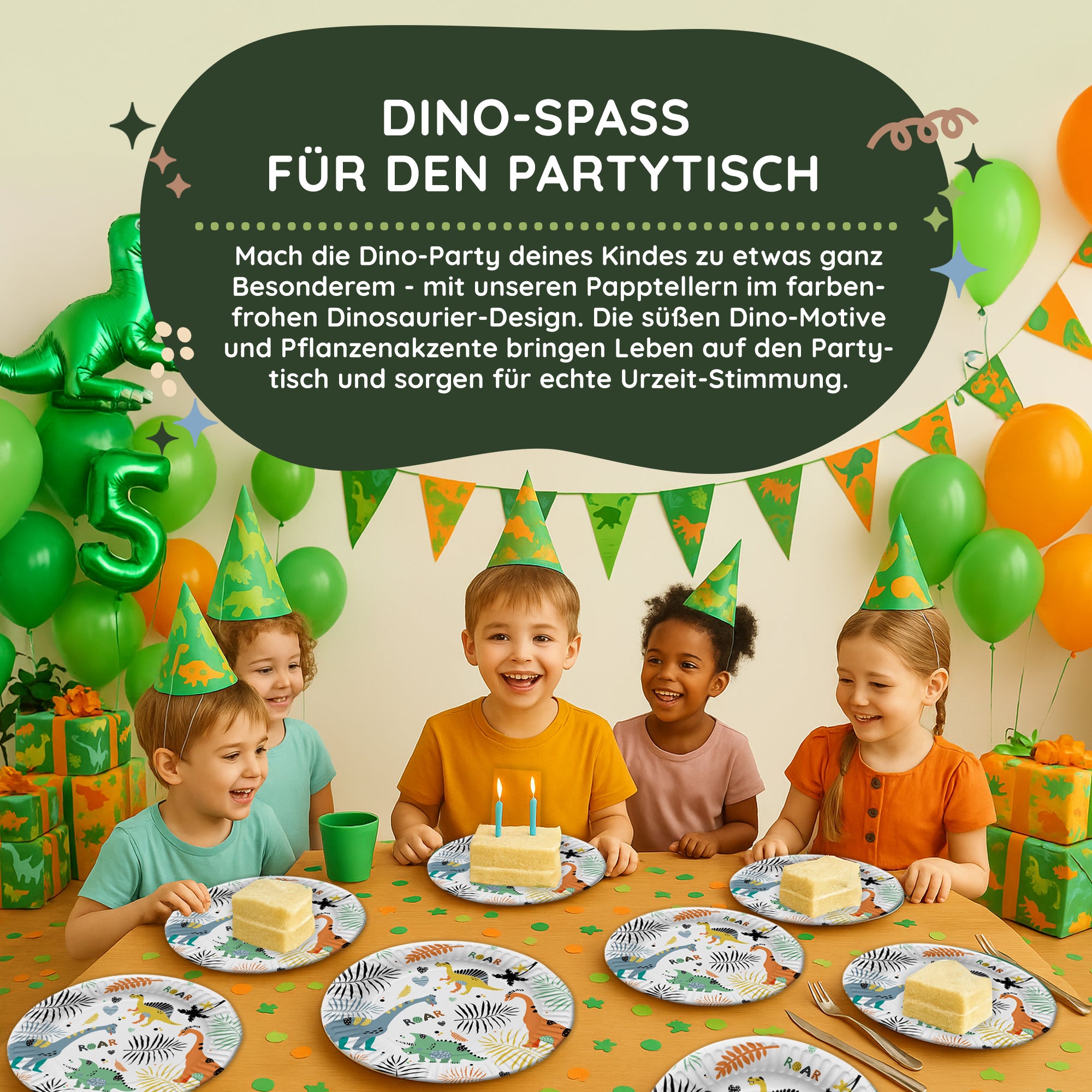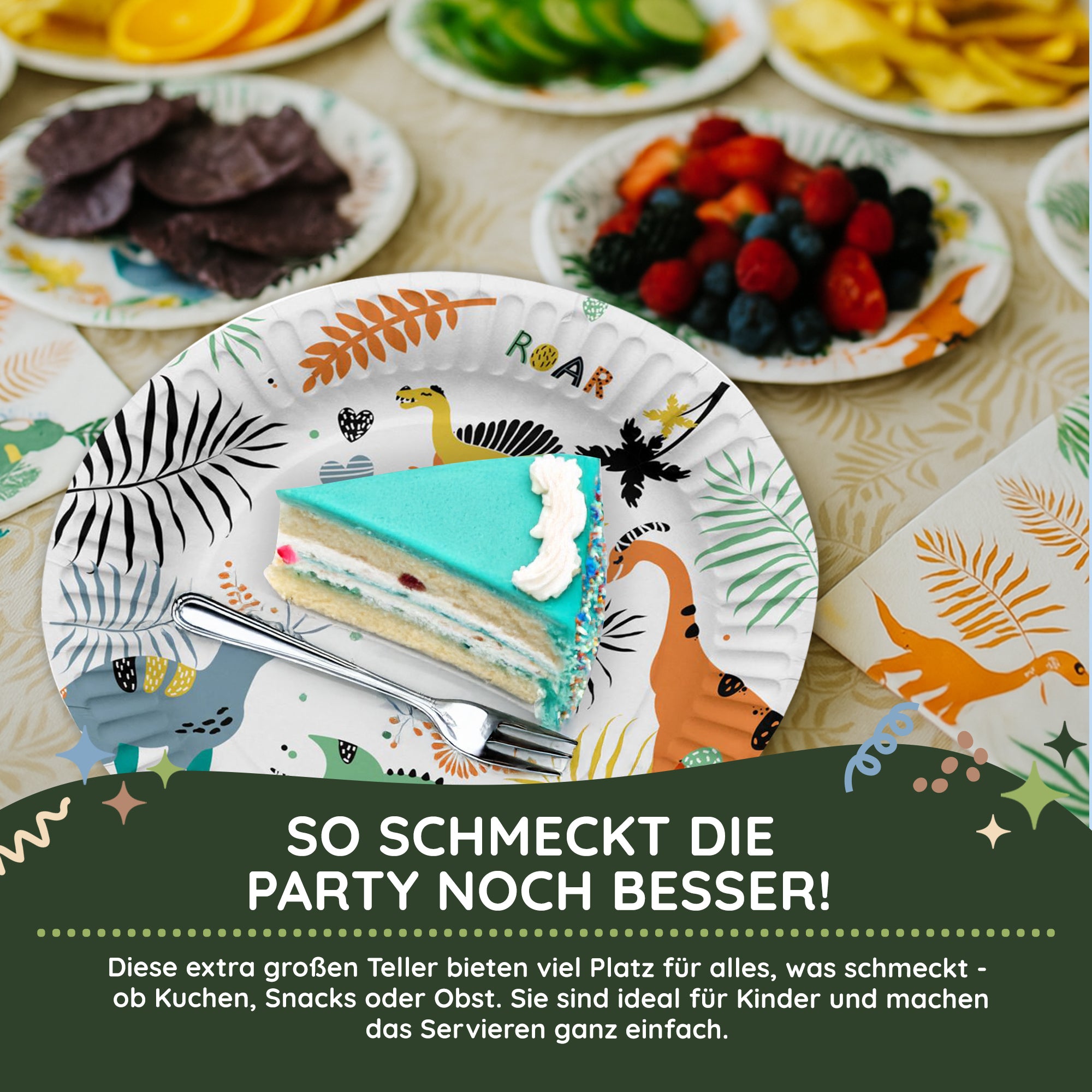 Auf einem Kindergeburtstag im Dinosaurier-Motto dürfen diese Little Dino Pappteller nicht fehlen! Die aufgedruckten Dinosaurier laden freundlich ein um den 23 cm großen Teller mit Snacks und Leckereien zu beladen.