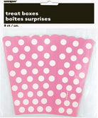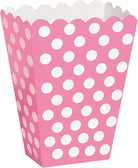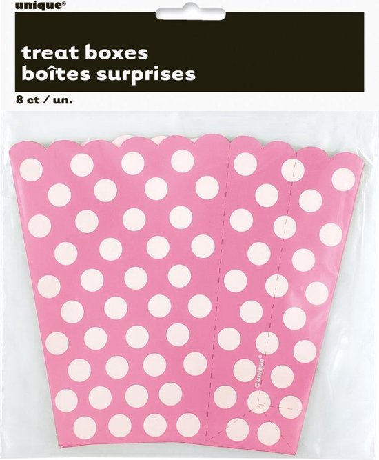 Die 8 Snack Box Lucy Pink gepunktet 14cm eignen sich hervorragend für diverse Anlässe. Durch die schräge Form ist die Größe unten 6,5cm x 4cm und oben an der Öffnung 9,5cm x 6cm