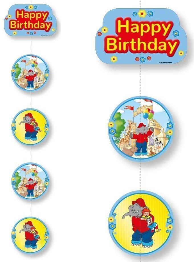 Der Benjamin Blümchen Deckenhänger hat eine Länge von 1,5m und ist beidseitig bedruckt. Die 4 runden Schilder haben eine Größe von 18cm, das Kopteil ist 25cm x 15cm groß und mit der Aufschrift Happy Birthday bedruckt. Eine tolle Deko für alle kleinen Fans des sprechenden Elefanten.