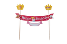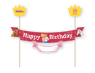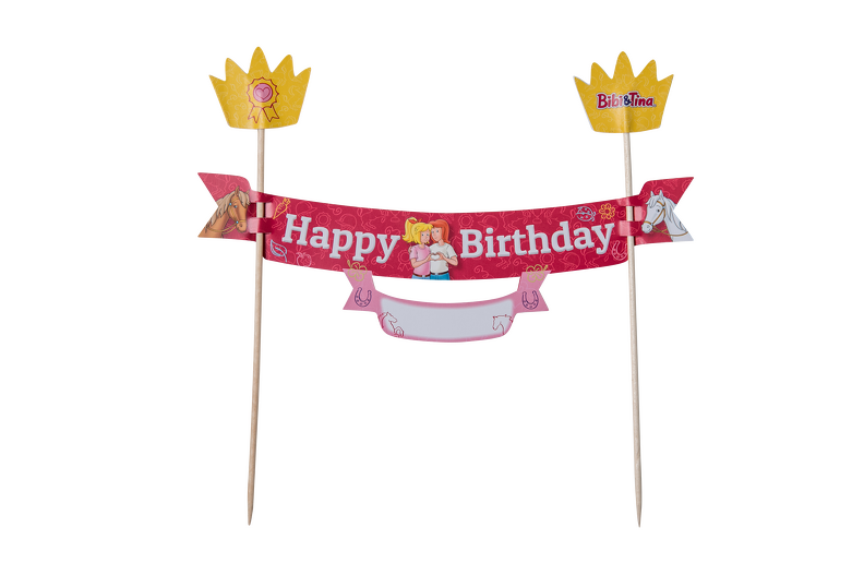 Tortenbanner aus 300 g Pappe ca. 23 cm breit und 6 cm hoch mit NamensfeldHolzpickern ca. 20 cm hoch mit Fähnchen im Bibi und Tina Design