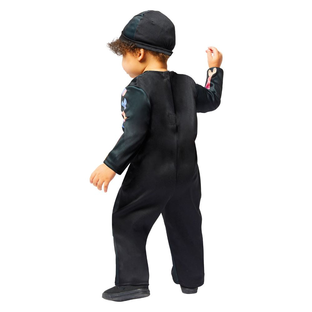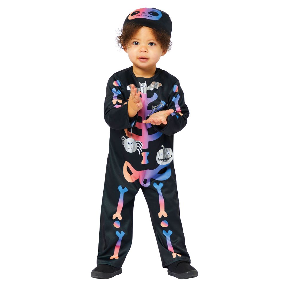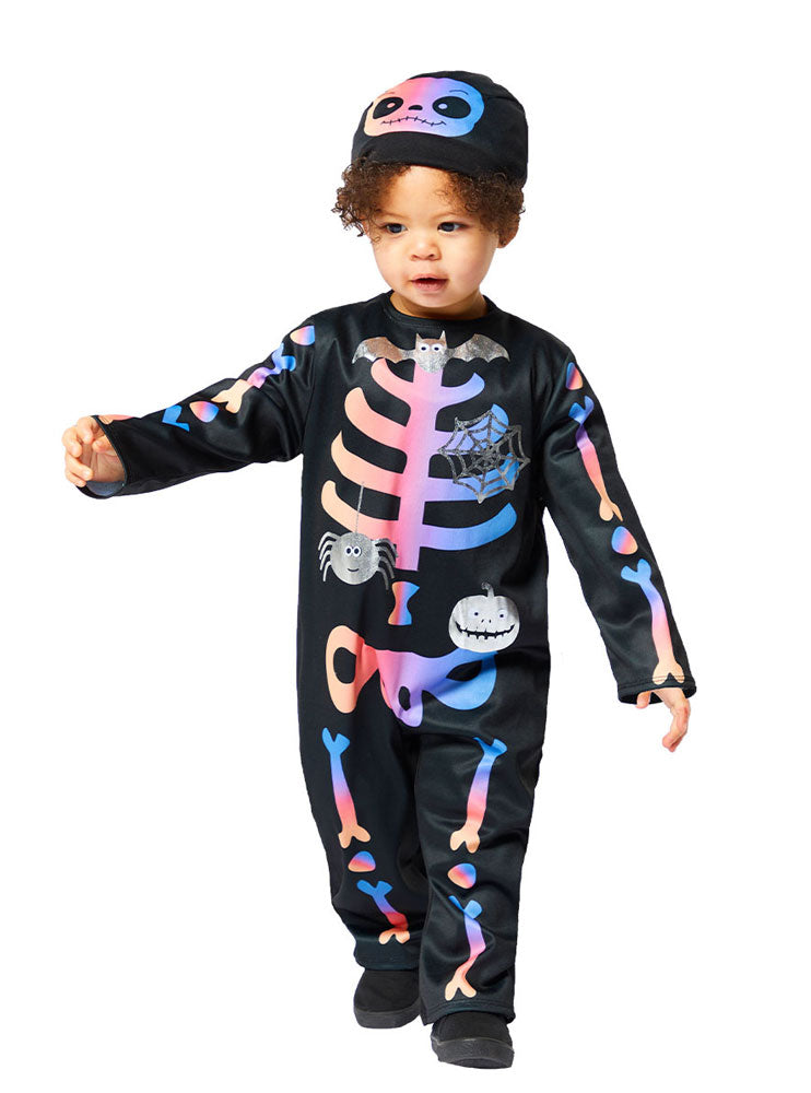 Knochig macht lustig! Das Colorful Skeleton Kinderkostüm besteht aus einem bunt beduckten Overall mit einer passenden Haube.