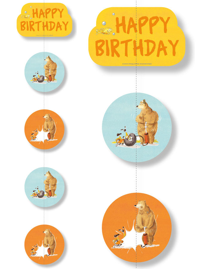 Der Dr. Brumm Deckenhänger hat eine Länge von 1,5m und ist beidseitig bedruckt. Die 4 runden Schilder haben eine Größe von 18cm, das Kopteil ist 25cm x 15cm groß und mit der Aufschrift Happy Birthday bedruckt. Eine tolle Deko für alle kleinen Fans des tollpatschigen Bären.