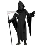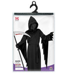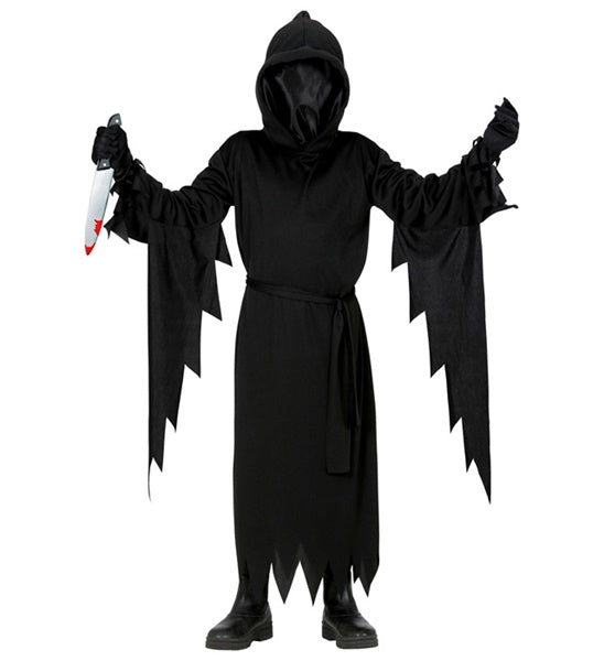 Spaziere an Halloween im Gesichtsloser Sensenmann Kinderkostüm durch die Straßen und sorge so für Angst und Schrecken bei deinen Nachbarn. Zur Verkleidung gehört die lange schwarze Robe und eine schwarze Maske, die deine Identität geheim hält.