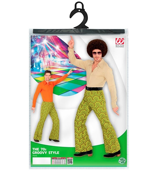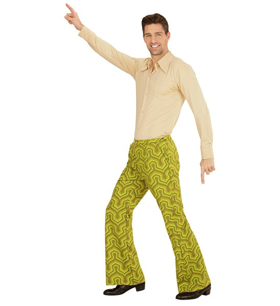 Das grünliche Muster dieser Schlaghose erinnert stark an die Tapeten der 60er Jahre, aber macht angezogen sicher eine gute Figur. Der Gummizug am Rücken sorgt für einen bequemen Sitz. Mit Knopf und Hosentaschen ausgestattet, kann es auf die nächste Hippie- oder Schlagerparty gehen.