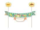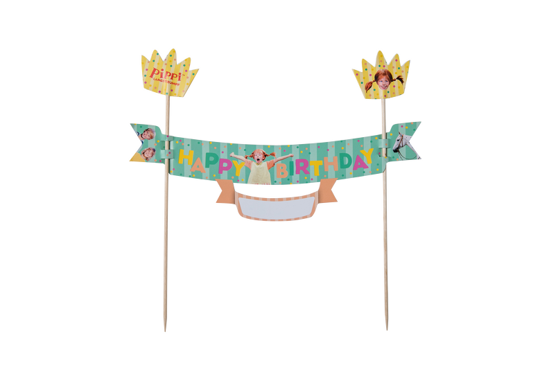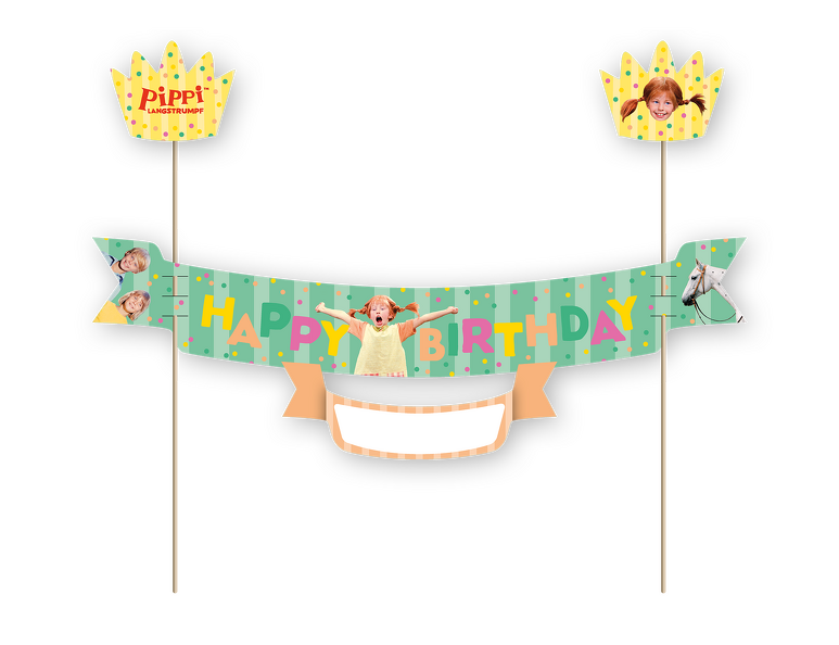 Tortenbanner aus 300 g Pappe ca. 23 cm breit und 6 cm hoch mit NamensfeldHolzpickern ca. 20 cm hoch mit Fähnchen im Pippi Langstrumpf Design