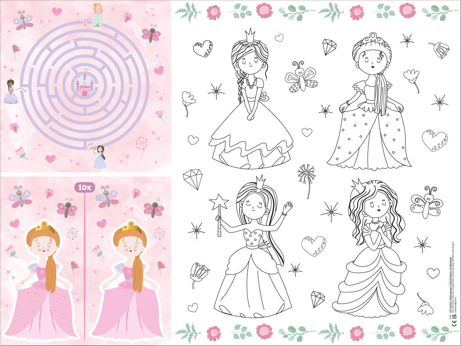 Im Lieferumfang enthalten sind insgesamt 6 Papier Tischsets. Es gibt 2 Spiele: ein Labyrinth und Finde den Unterschied, weiterhin kannst Du auf der Ausmalseite malen.