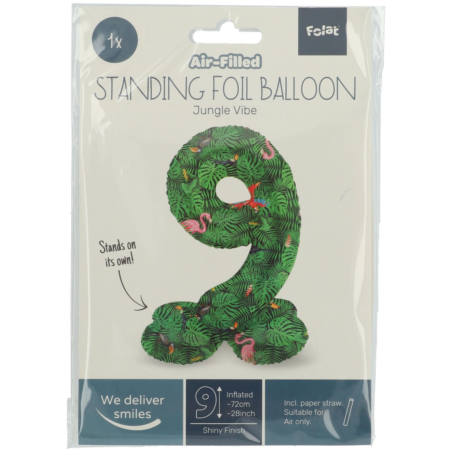 Die neuen 72cm großen Riesenballons sind auf jeder Party ein richtiger Hingucker und natürlich auch als Geschenk ein absolutes Highlight. Mittels eines Strohhalmes wird der stehende Zahl 9 Ballon Dschungel ganz leicht aufgepustet und somit nur mit Luft gefüllt. Eine Befüllung mit Helium ist somit nicht notwendig. Der Ballon besteht aus mehreren Teilen, die du einfach miteinander verbindest. Eine Anleitung dafür liegt bei.