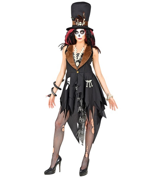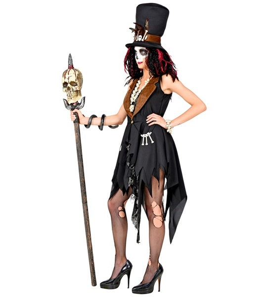 Das Voodoo Priesterin Kostüm für Damen besteht aus einem Kleid, das in Fetzen hängt und einem großen Hut mit Knochen- und Federapplikationen. Vervollständige dein Outfit zu Halloween mit dem passenden Make-Up und einigen schaurigen Accessoires wie beispielsweise Knochenschmuck oder tote Tiere aus Kunststoff.