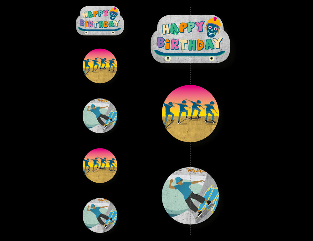 Mit den Keep Rolling Deckenhängern kannst du das Thema deiner Party noch einmal aufgreifen. Das bunte Happy Birthday Schild in 25 x 15cm wird durch 4 beidseitig bedruckte Schilder in der Größe 18 x 18cm ergänzt.