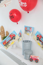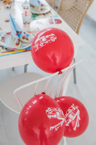 8 Luftballons Umfang ca. 90 cm, 1 Motiv Feuerwehrauto , roter Ballon zweiseitig bedruckt , 1te Seite schwarzer Druck , 2 te Seite weißer Druck