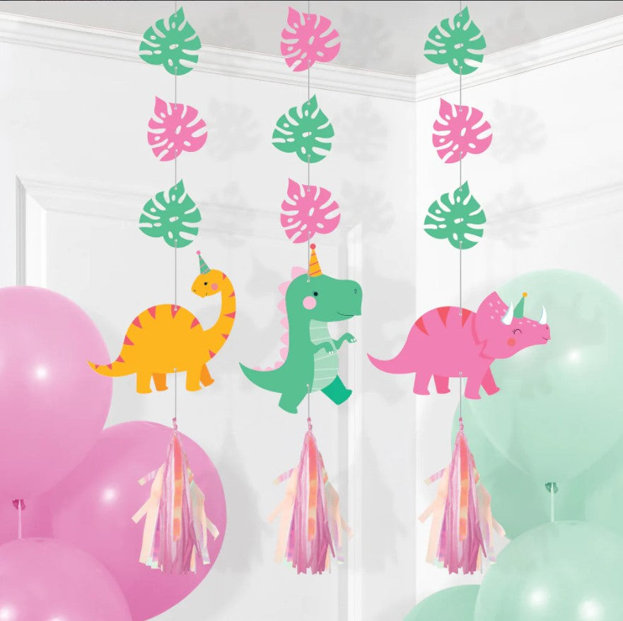 - Eine Ballongirlande in Form eines Dinosauriers: Dafür kannst du verschiedene Farben in Kombination mit Dinosaurier-Ballons auf einem Ballonband aufreihen.