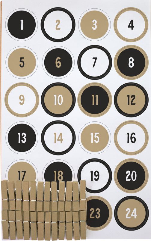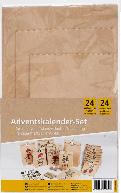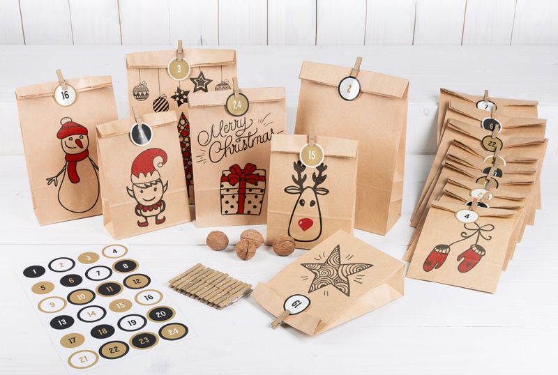 DIY Adventskalender Set 24 Tütchen (unbedruckt), Aufkleber und Klammern