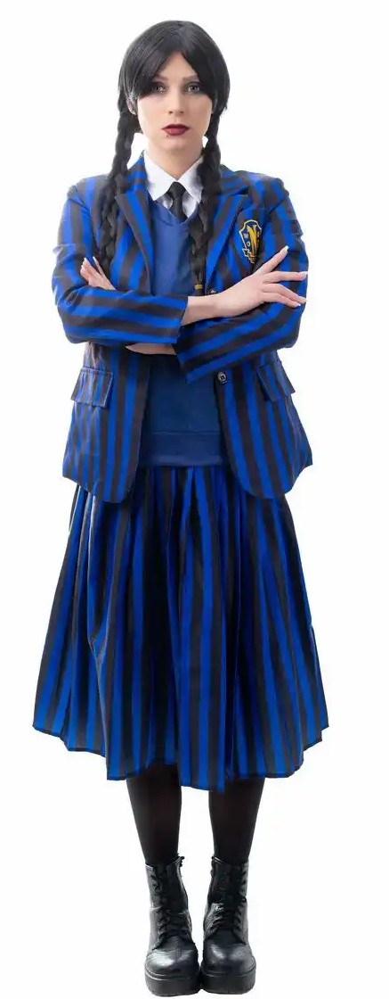 Diese besondere Uniform aus der Netflix-Serie Wednesday orientiert sich am unverwechselbaren Stil von Wednesday Addams selbst. In Schwarz- und Blautönen gehalten, hebt sie sich von der regulären Schuluniform ab und vermittelt die geheimnisvolle Aura der wohl bekanntesten Schülerin der Nevermore Academy.