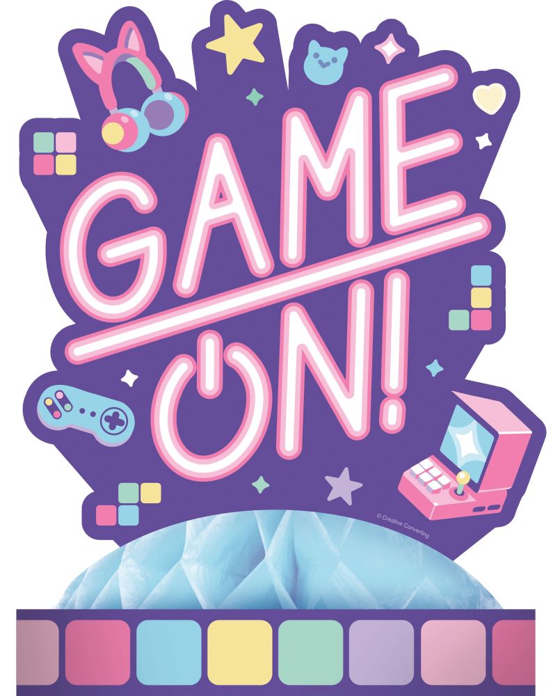 Du schmeißt eine Gamer Girl Party? Dann haben wir die perfekte Tischdeko für dich! Der Gamer Girls Tischaufsteller verziert mit dem Schriftzug 'GAME ON' deinen Tisch. Der Tischaufsteller ist 23 x 30 cm groß und erstrahlt in rosa und lila.
