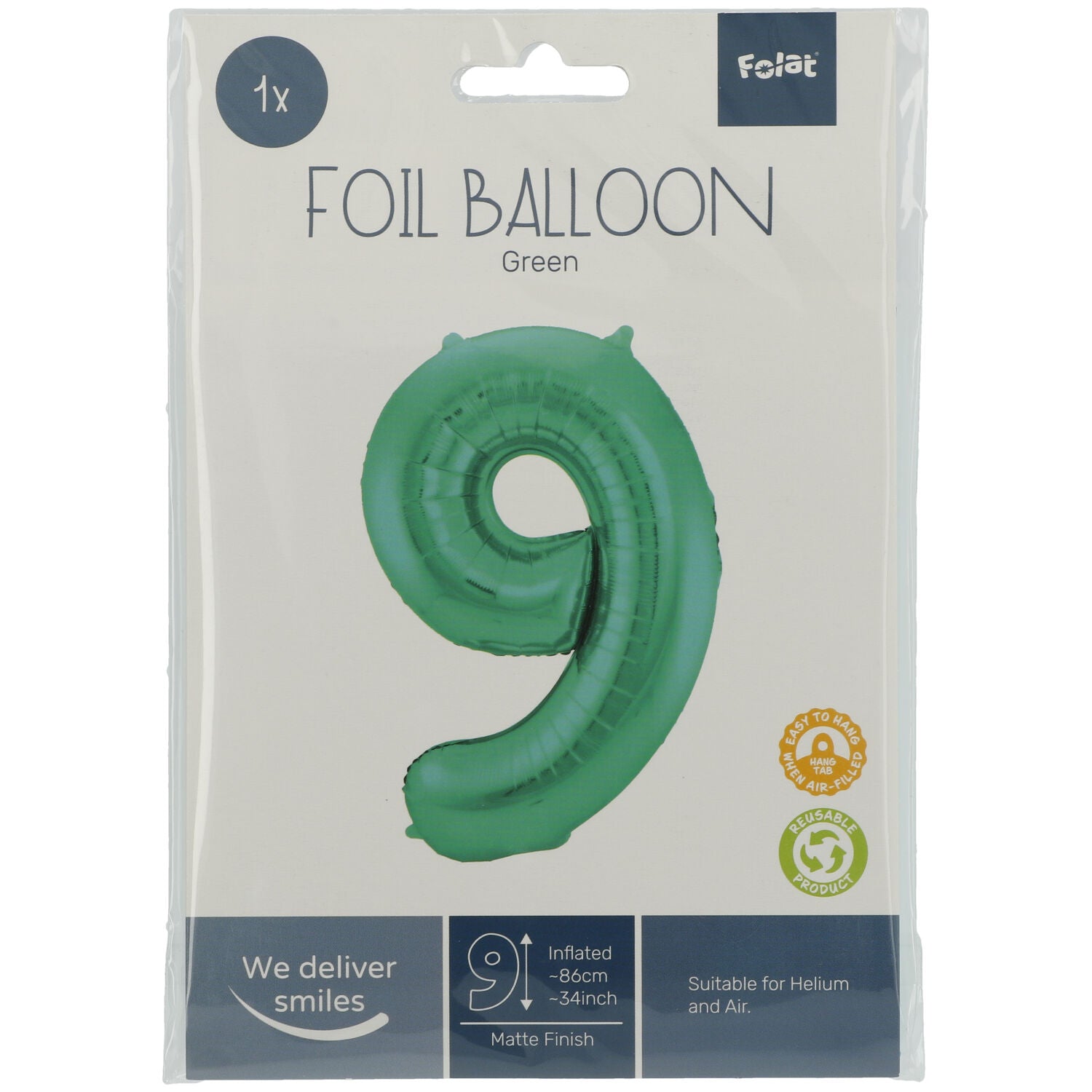 Unsere Zahlen-Folienballons mit einer Höhe von 86cm sind die perfekte Überraschung für Groß und Klein. Egal ob zum Geburtstag, als Tischnummer zur Hochzeit oder zum Jubiläum - Der Folienballon Zahl 9 in Metallic-Grün setzt jeden Anlass passend in Szene. Die Ballons sind für eine Helium- oder Luftfüllung geeignet. Kleine Laschen am oberen und unteren Ende der Zahl machen eine Dekoration als Girlande möglich. Der Kreativität sind mit den wunderbaren Luftballons keine Grenzen gesetzt.