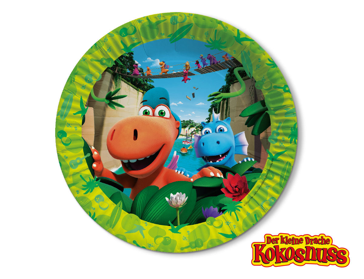 Zu jedem Kindergeburtstag gehört auch die passende Partydeko. Und die 8 Kleiner Drache Kokosnuss Teller sind genau das Richtige für alle kleinen Fans. Zu sehen ist der Drache Kokosnuss und seine Wasserdrachen-Freundin Wokki. Der Tellerrand ist in frischem Grün gehalten und mit Palmenblättern, Kokosnüssen und Gitarren verziert.