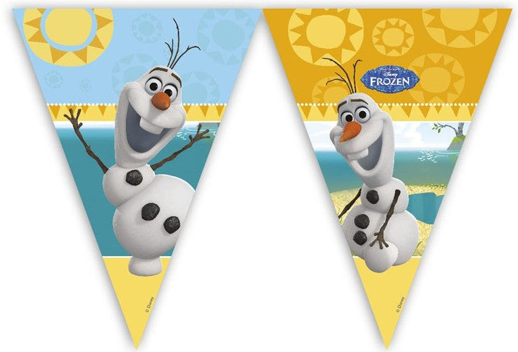 EIn Schneemann im Sommer? So etwas schafft nur Olaf. Der neidliche Schneemann aus Frozen wünscht sich nichts sehnlicher als den Sommer am Meer zu verbringen. Ob zur Sommerparty oder zum Geburtstag - mit der Olafs Sommerspaß Wimpelkette holst du dir ein bisschen Sonnenschein ins Haus. Die Wimpelkette besteht aus neun Wimpeln, die eine Größe von 17 x 25cm haben- Insgesamt ist die Wimpelkette 2,3m lang.