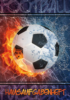 Das Hausaufgabenheft mit Fussball  ist mit einem Fußball -  im Kampf mit Feuer und Wasser -  bedruckt.