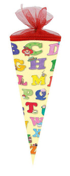 Die Schultüte ABC Alphabet misst eine Höhe von 35cm, hat eine rote Textilborte und wird mit Tüll verschlossen.