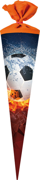 Auf dieser Schultüte mit Fussball bekämpfen sich Feuer und Wasser und es entsteht ein cooles Design.