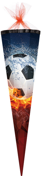 Auf dieser 6-eckigen Fußball Schultüte bekämpfen sich Feuer und Wasser und es entsteht ein cooles Design.