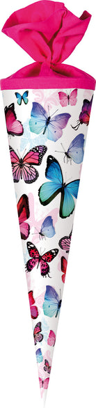 Die Schultüte mit Schmetterlingen ist bedruckt mit vielen bunten Schmetterlingen. Diese könnten symbolisch für die kleinen Schulmädchen stehen, diese sind älter geworden, sind gewachsen, haben Flügel bekommen und können nun in die aufregende Schulzeit starten.