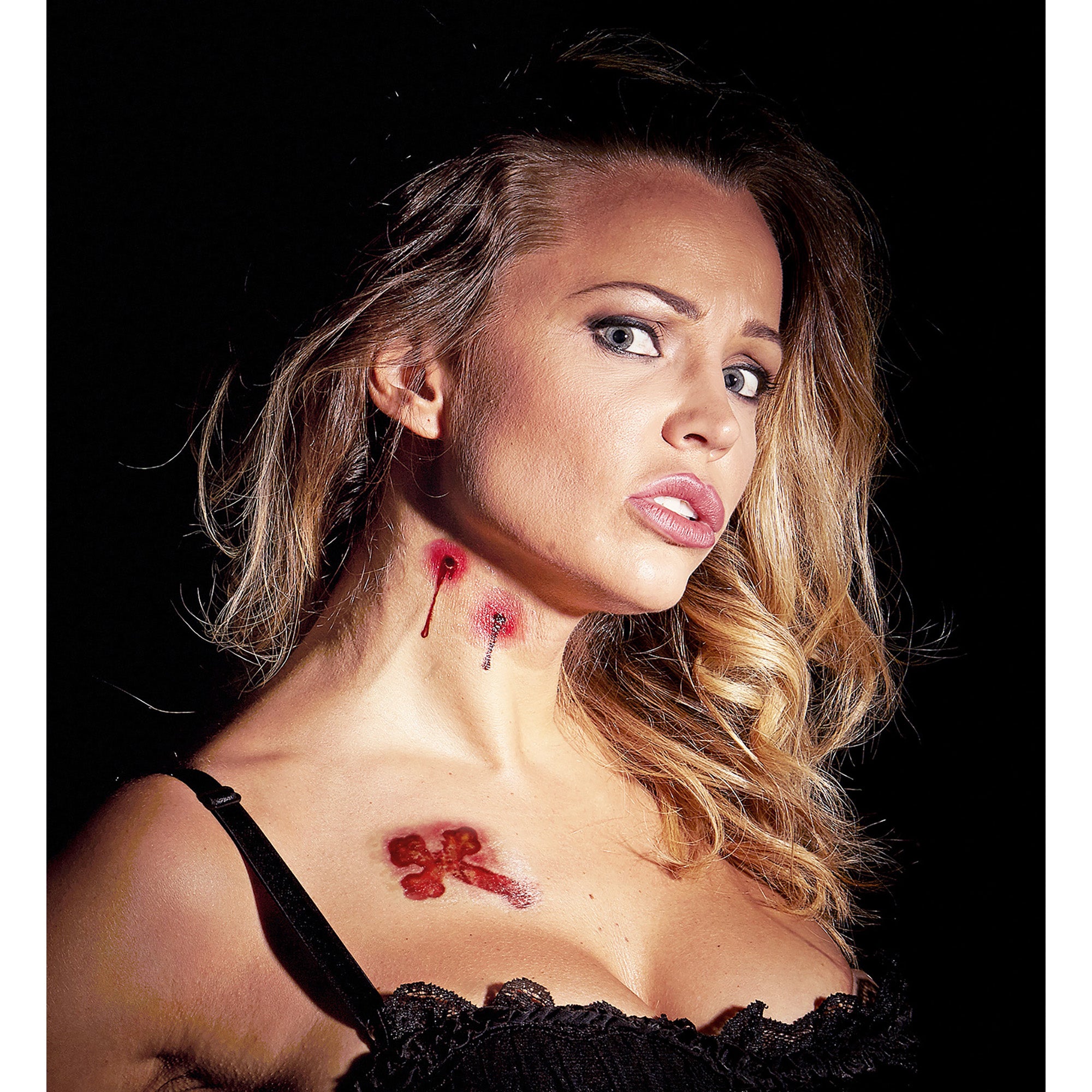 Für authentische Vampir Bissspuren zu deinem Horror-Kostüm musst du dich nicht mehr auf die gefährliche Suche nach echten Vampiren begeben. Diese Vampir Bissspuren Tattoos mit 6 Motiven sind mindestens genauso schaurig! Einfach mit Wasser auf die Haut kleben und im Handumdrehen zum Vampir-Opfer werden. Zu sehen sind dann die blutigen Wunden der spitzen Vampirzähne, aber auch ein blutiger Abdruck eines Kreuzes ist dabei. Je nach Motiv haben die Tattoos eine Länge von 3,5 bis 8cm. Um die Wirkung deines schaurigen Kostüms noch zu verstärken, empfehlen wir dir zum Beispiel Kunstblut, das dein Outfit noch weiter aufpeppt.
