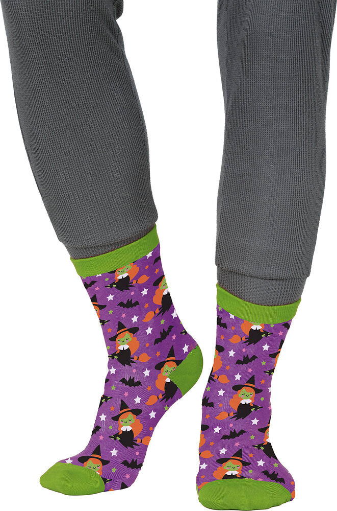 Mit diesen farbenfrohen Halloween-Socken fliegen kleine Füße stilvoll durch die gruseligste Zeit des Jahres! Lustige Hexen auf Besen, flatternde Fledermäuse und leuchtende Farben sorgen für magischen Tragespaß – ob in Schule, Kita oder beim Halloween-Umzug.