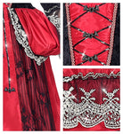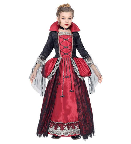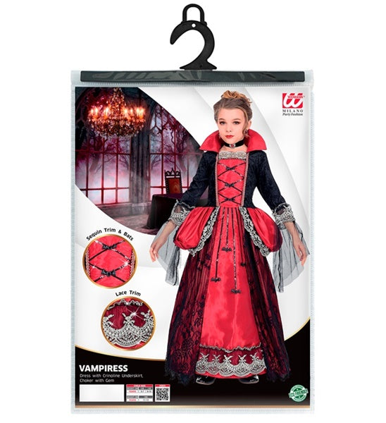 Dieses ausgefallene Viroletta Vampir Kostüm für Kinder überzeugt mit den zahlreichen Details am Kleid und mit der tollen Farbkombination aus Rot und Schwarz. Zum Kostüm gehört auch ein Reifrock und das schwarze Halsband mit dem roten Stein. Perfekt, für Halloween, Karneval oder andere Kostümpartys.