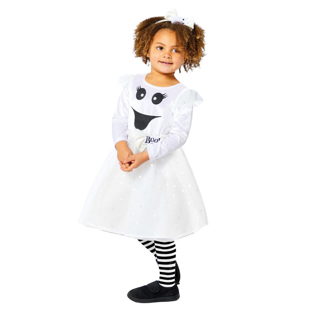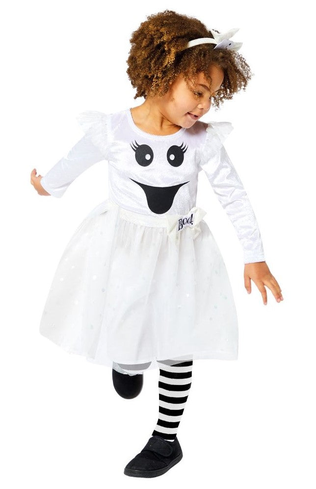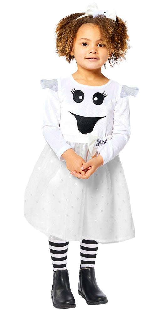 Gespenstisch entzückend! Das Boo Gespenster Mädchen Kostüm besteht aus einem wunderschön designten Kleid mit einem lustigen Gespenstergesicht und einem passenden Haarreif.