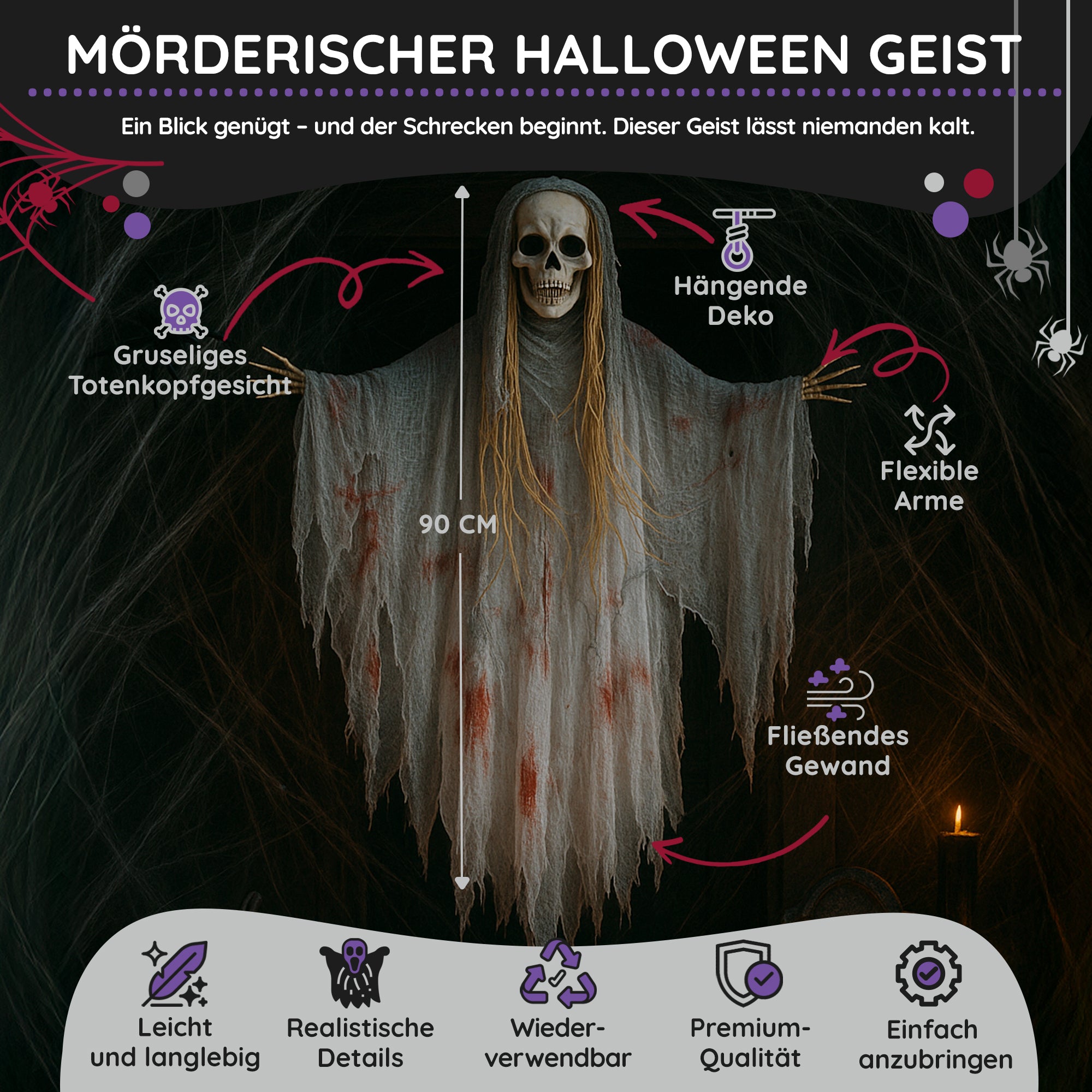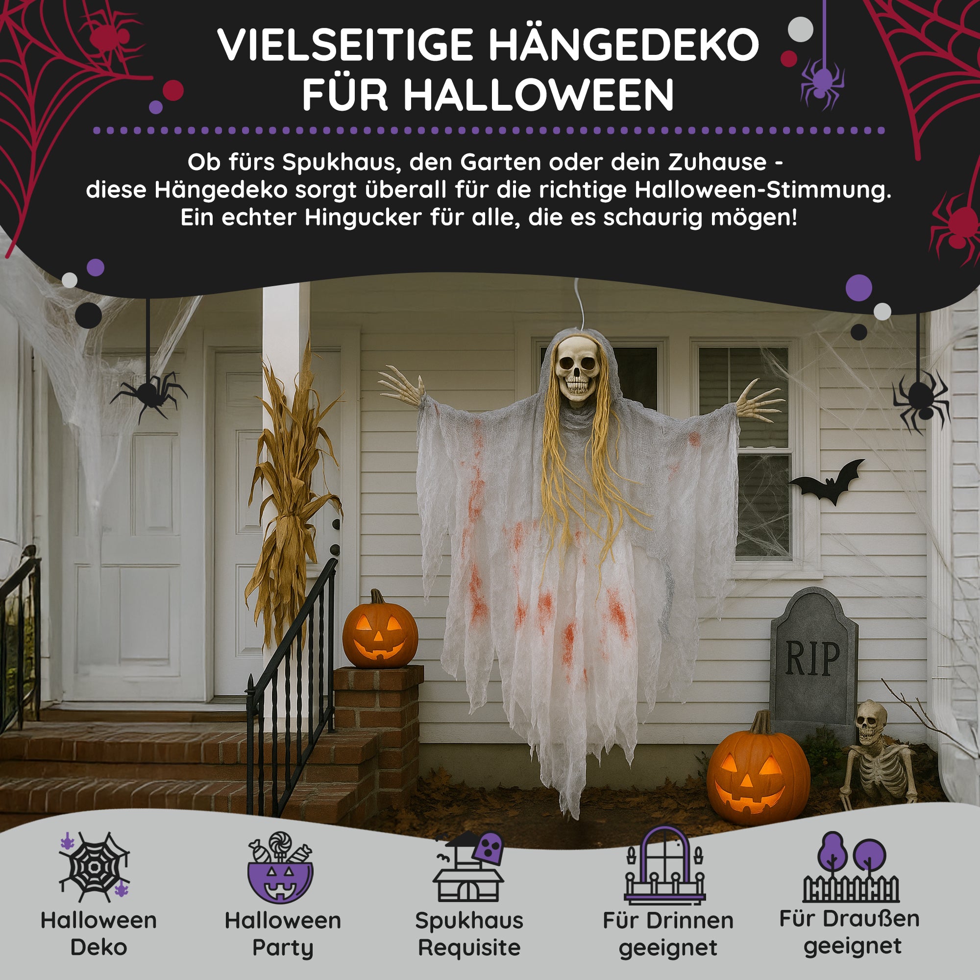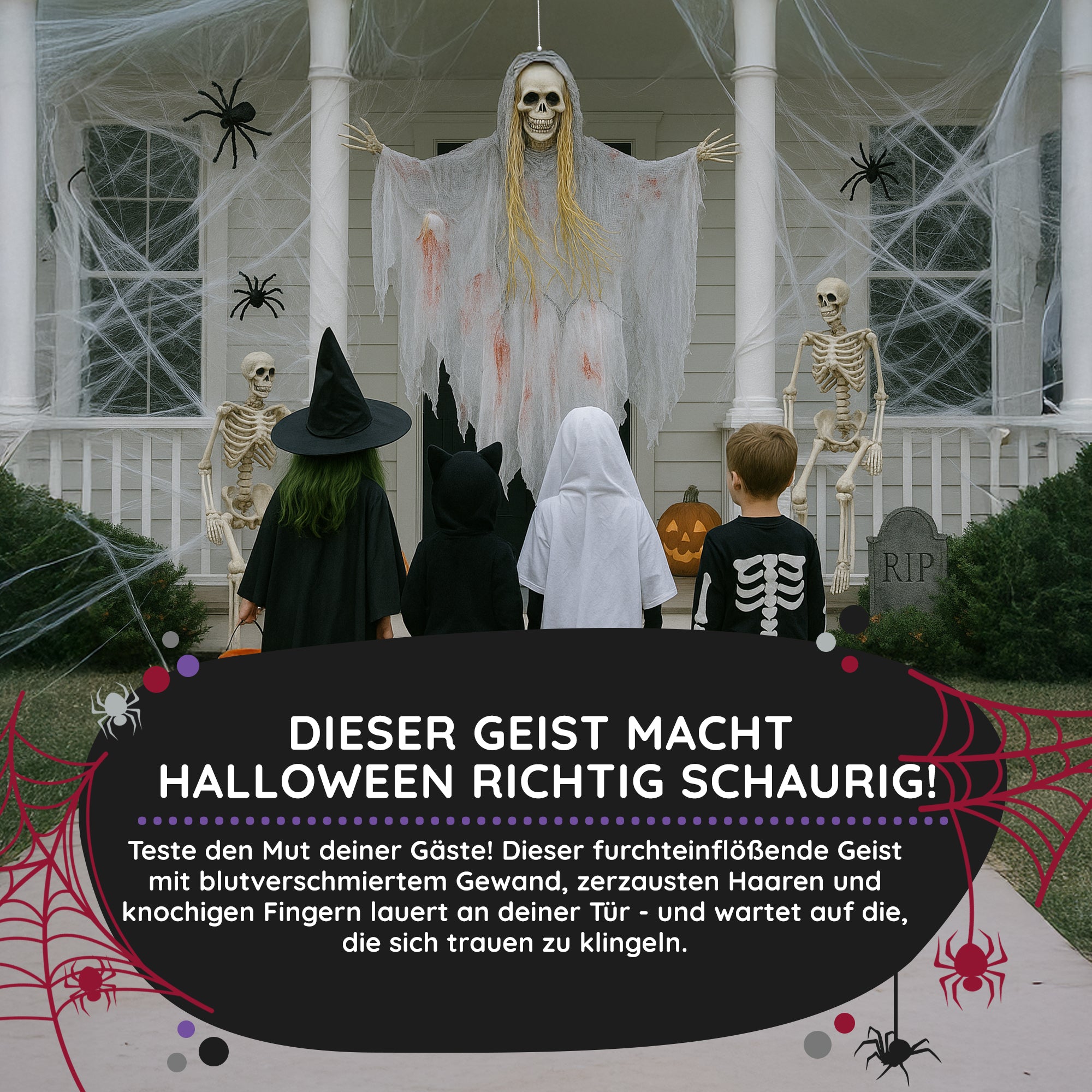Ziert dieses Dekogespenst euren Hauseingang wird das Klingeln zur ernsthaften Mutprobe. Der Bloody Party Mörderische Halloween Geist sollte gut einen Meter über dem Boden befestigt werden, denn so lang ist das blutbeschmierte Fetzengewand (90cm). Lange graue Haare fallen von dem Schädel herab und an den Seiten ragen die angefaulten Fingerknochen heraus. Schnapp selbst zu, bevor sie dich greifen!