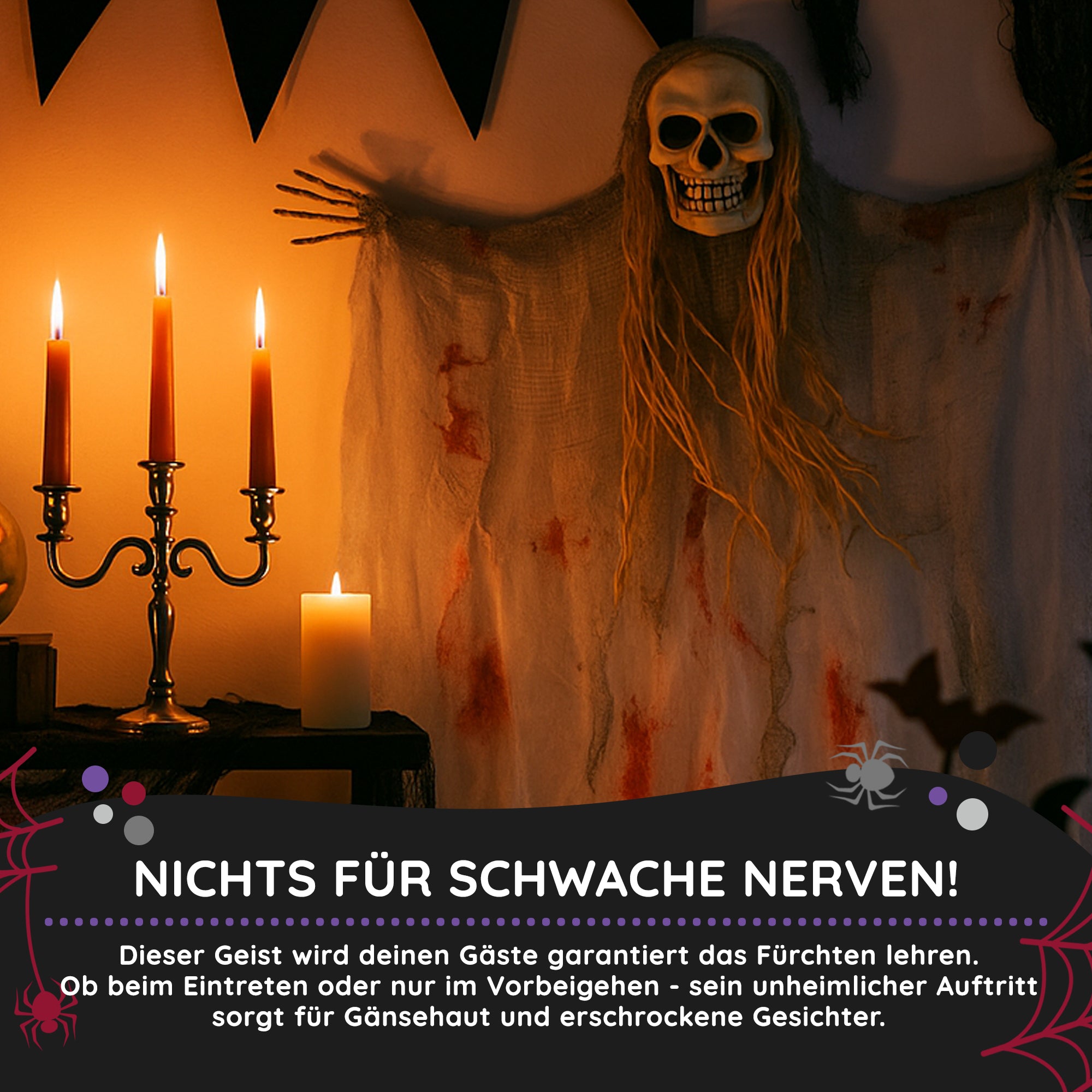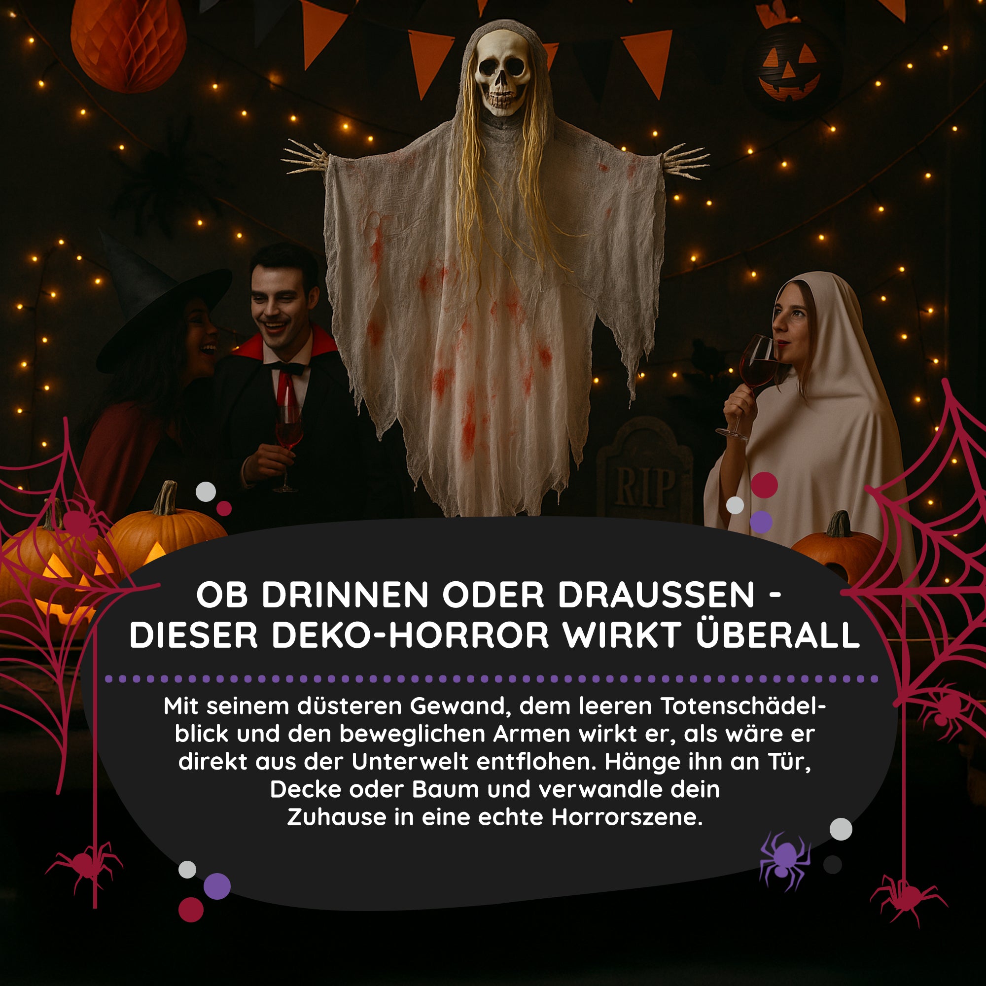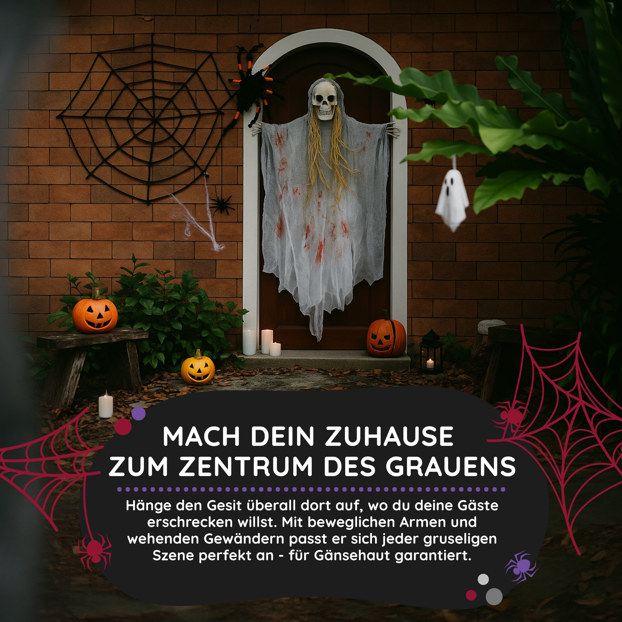 Ziert dieses Dekogespenst euren Hauseingang wird das Klingeln zur ernsthaften Mutprobe. Der Bloody Party Mörderische Halloween Geist sollte gut einen Meter über dem Boden befestigt werden, denn so lang ist das blutbeschmierte Fetzengewand (90cm). Lange graue Haare fallen von dem Schädel herab und an den Seiten ragen die angefaulten Fingerknochen heraus. Schnapp selbst zu, bevor sie dich greifen!