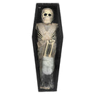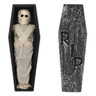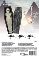 Mumien-Deko-Set (Mumie im Sarg (69x23x10cm), 3 Knochen (14cm), 1 Spinnennetz, 3 Spinnen (10x9cm)
