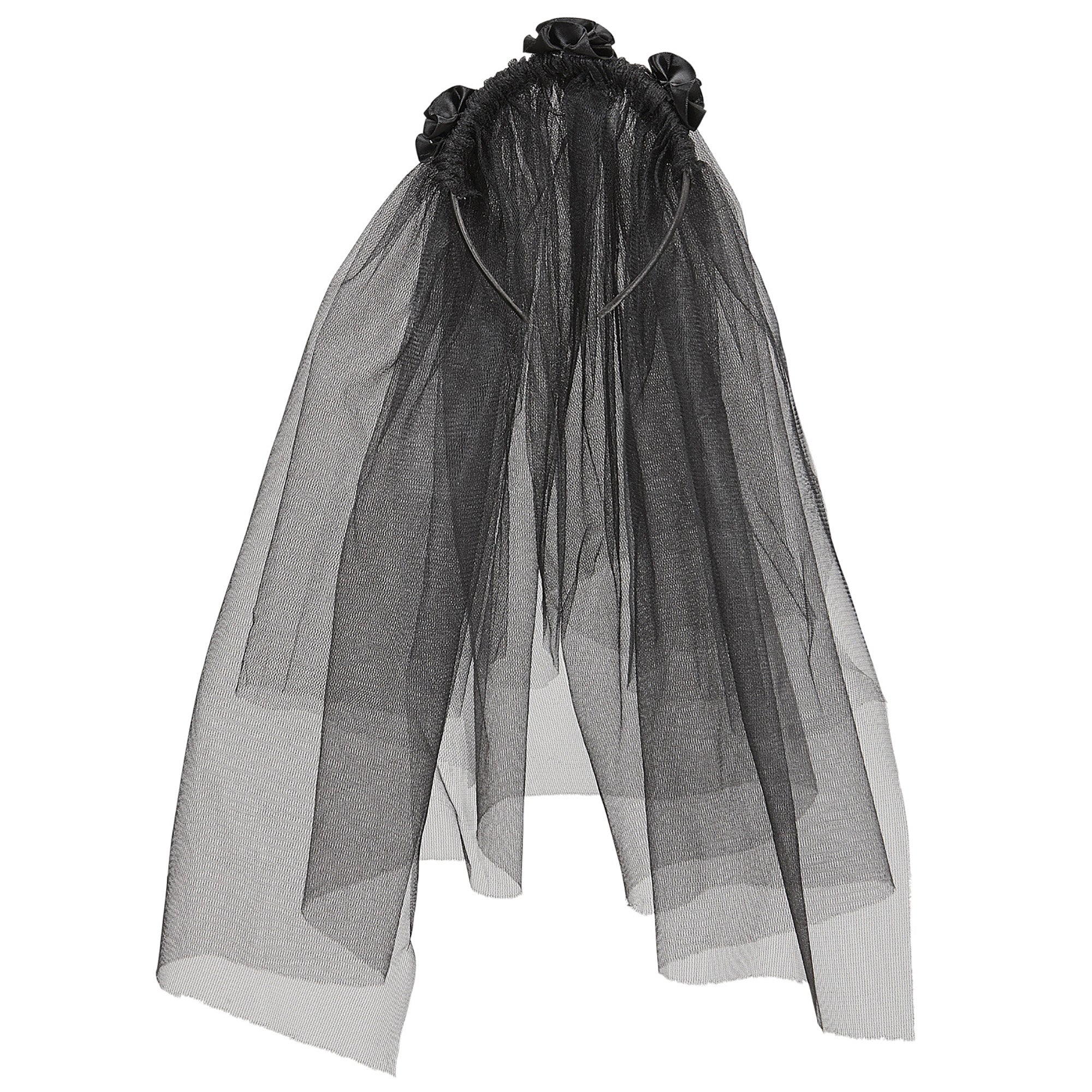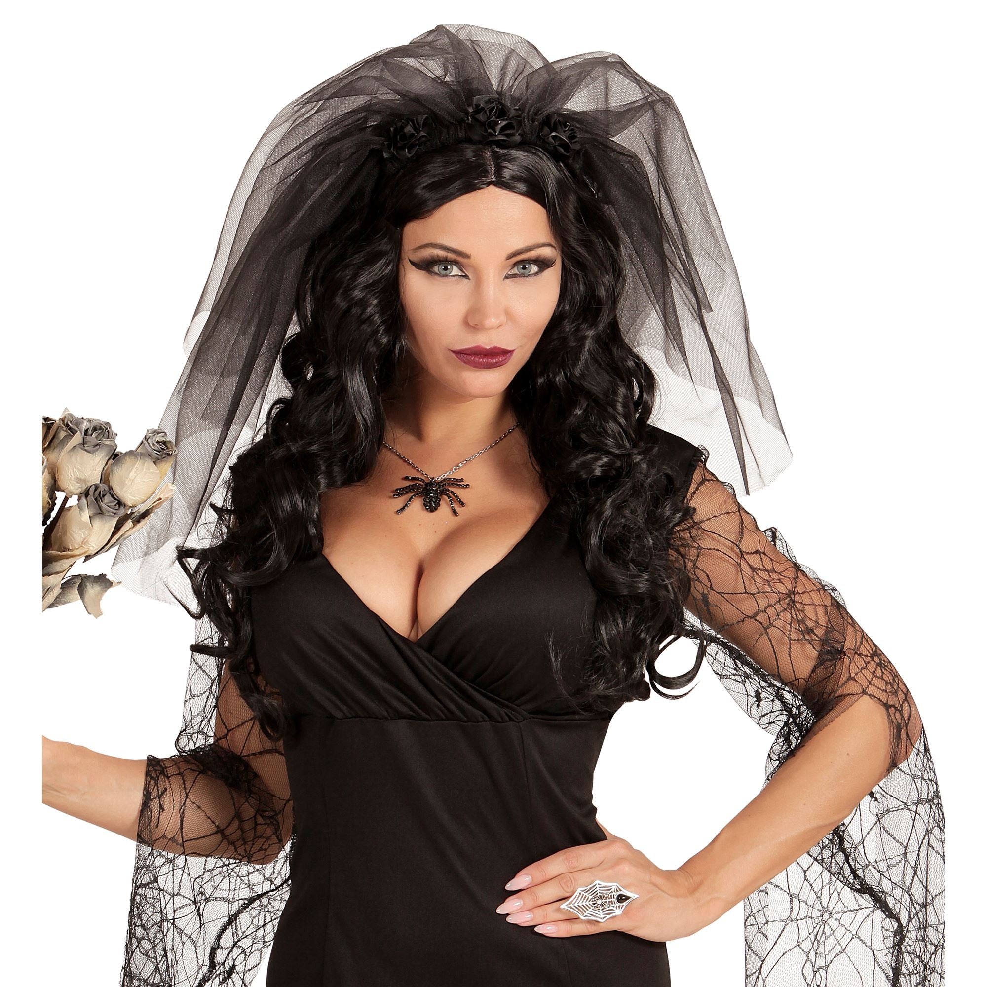 Der schwarze Brautschleier mit Rosen ist für eine Vielzahl von Anlässen ideal geeignet. Ob als Zombiebraut, Horrorbraut oder andere Gruselgestalten, diese schwarze Kombination passt zu Allem.