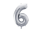 Metallischer Folienballon Nummer "6" in silberner Farbe, Größe vor dem Aufblasen ca. 86 cm (34''), Größe nach dem Aufblasen ca. 72 cm (28''). Zum Aufblasen mit Luft und Helium. Das Set enthält einen Strohhalm.
