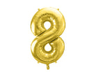 Satin-Folienballon Nummer "8" in hellgoldener Farbe, Größe vor dem Aufblasen ca. 86 cm (34''), Größe nach dem Aufblasen ca. 72 cm (28''). Zum Aufblasen mit Luft und Helium. Das Set enthält einen Strohhalm.