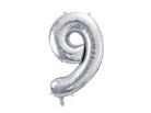 Metallischer Folienballon Nummer "9" in silberner Farbe, Größe vor dem Aufblasen ca. 86 cm (34''), Größe nach dem Aufblasen ca. 72 cm (28''). Zum Aufblasen mit Luft und Helium. Das Set enthält einen Strohhalm.